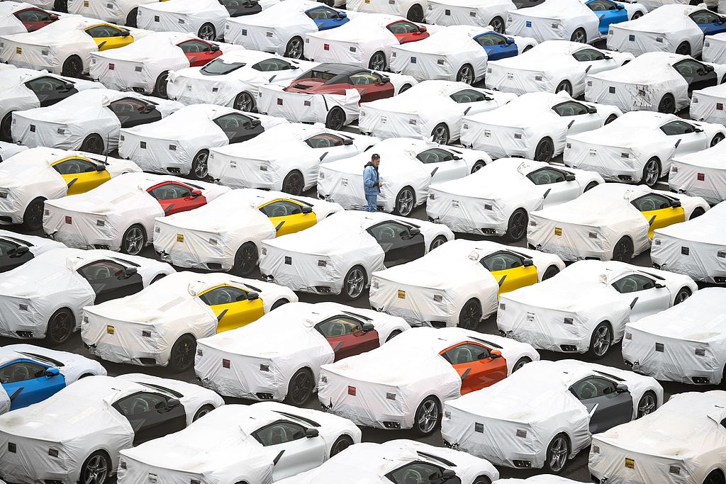 當?shù)貢r間2025年4月11日,日本橫濱大黑碼頭,停放著新車。