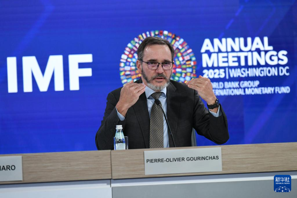 10月14日,在美國華盛頓,國際貨幣基金組織首席經濟學家皮埃爾-奧利維耶·古蘭沙(中)在《世界經濟展望報告》新聞發布會上講話。新華社記者 李睿 攝