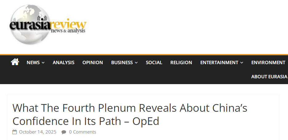 《歐亞評(píng)論》(Eurasia Review)網(wǎng)站題為《四中全會(huì)展示中國(guó)道路自信》的文章指出,中共二十屆四中全會(huì)的召開(kāi)釋放出最鮮明信號(hào),面對(duì)全球經(jīng)濟(jì)不確定性加劇的背景,中國(guó)依然展現(xiàn)出對(duì)自身發(fā)展道路的信心與戰(zhàn)略定力。