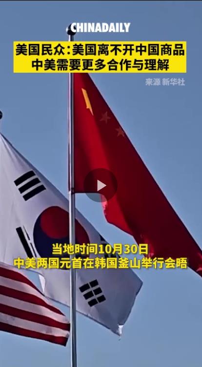 當地時間10月30日,中美兩國元首在韓國釜山舉行會晤。中國日報記者走訪美國街頭,了解美國民眾對此次會晤及中美關系的看法。民眾表示,美國和中國的貿易互依關系不容忽視,兩國需要更多溝通與合作。