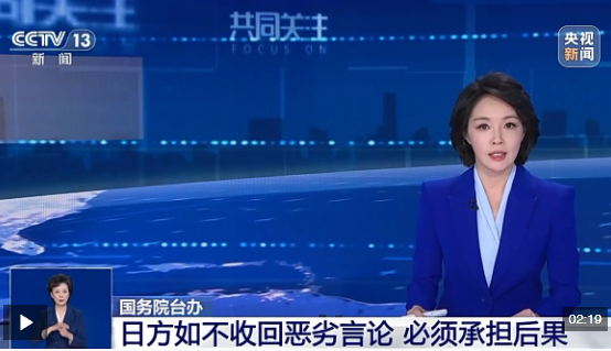 日本在臺灣問題上對中國人民負有歷史罪責。甲午戰爭后,日本強行侵占臺灣并進行長達半個世紀的殖民統治。日據時期,臺灣人民災難深重,數十萬同胞被殺害,民眾淪為“亡國奴”、毫無政治權利、信仰自由和文化自由,寶島的礦產資源、民生物資遭瘋狂掠奪。日本侵略者在臺灣犯下的罪行罄竹難書,是臺灣歷史最黑暗的一頁。包括臺灣同胞在內的全體中國軍民浴血奮戰,打敗了日本軍國主義侵略者,贏得抗日戰爭偉大勝利,光復臺灣。在抗戰勝利、臺灣光復80周年之際,日方不是反省罪惡歷史、吸取慘痛教訓,其首相高市早苗反而拋出涉臺露骨言論且態度惡劣,妄圖介入臺海局勢、否定抗戰勝利成果、挑戰戰后國際秩序。對此,中國政府、中國人民決不答應、決不容忍、決不姑息。日方如不立即糾正錯誤,收回惡劣言論,必須承擔由此引發的一切后果。如其膽敢武力介入臺灣問題,我們必將予以迎頭痛擊、堅決粉碎。