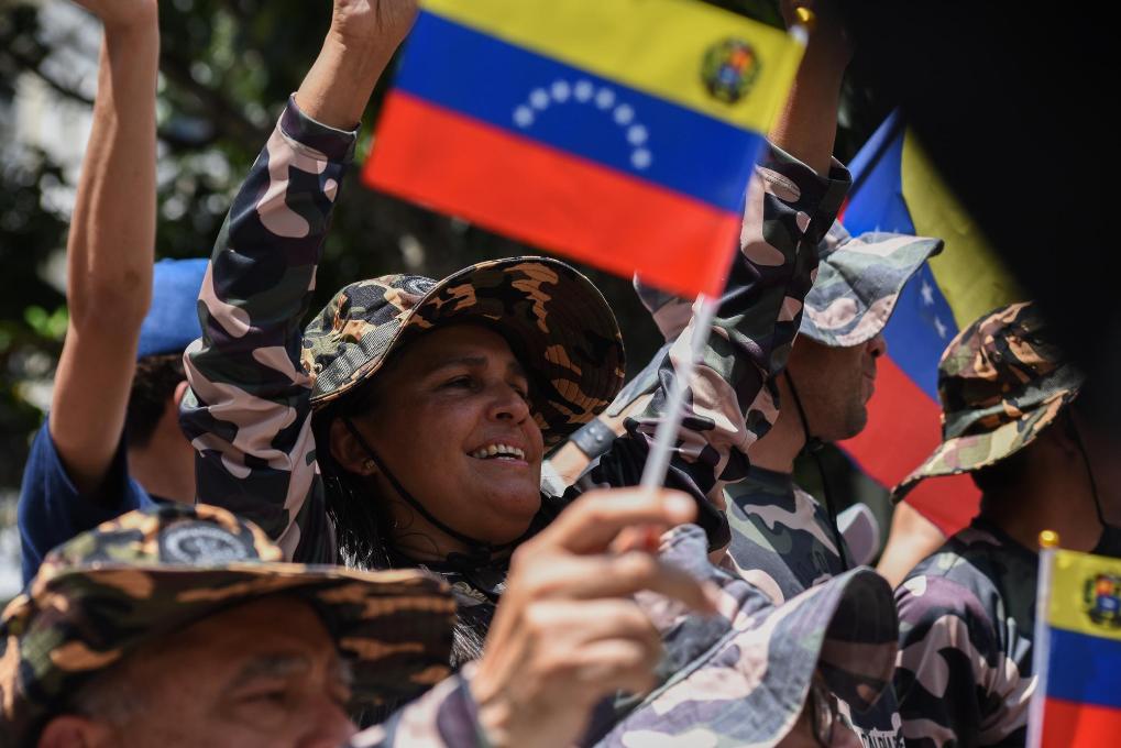 10月4日,在委內瑞拉首都加拉加斯的玻利瓦爾廣場,玻利瓦爾民兵組織成員參與全國特別軍事演習。新華社發(馬科斯·薩爾加多攝)