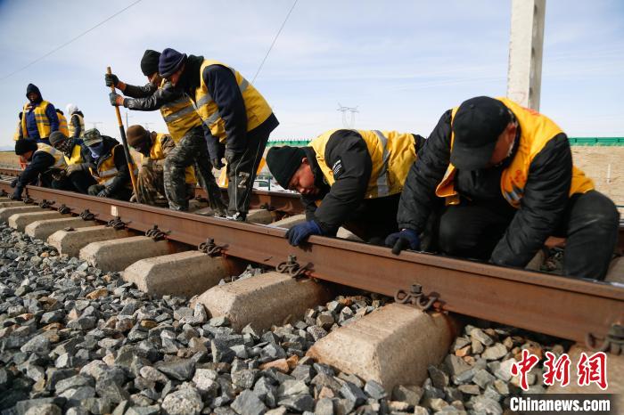 1月22日,北方小年,中國鐵路青藏集團有限公司德令哈工務段關角隧道工區“00后”職工郝斌(右一)、趙鵬舉(右二),在天窗作業(為鐵路維修養護,施工預留的時間段)過程中將厚度不一的墊板安裝到鋼軌底部,整治線路凍害。中新社記者 馬銘言 攝