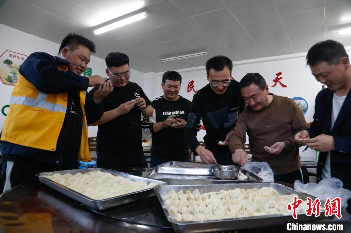 1月22日,中國北方小年,青藏集團公司德令哈工務段關角隧道工區“00后”職工郝斌(左二)、趙鵬舉(左一)和工友們包餃子。中新社記者 馬銘言 攝
