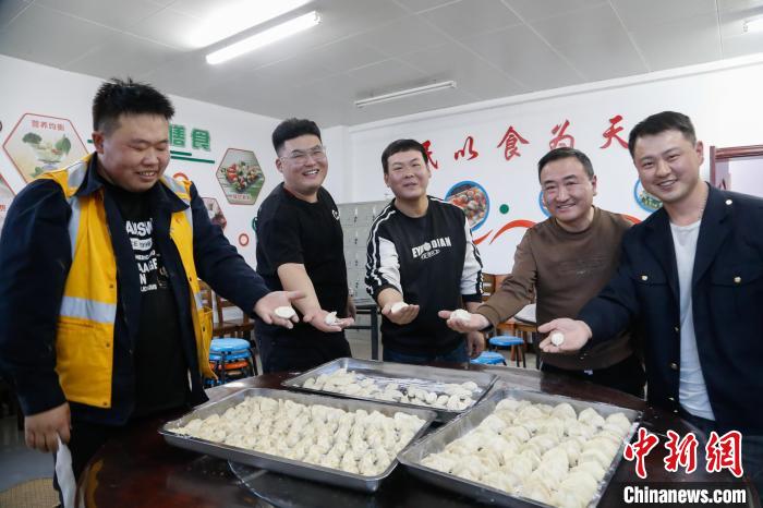 1月22日,中國北方小年,青藏集團公司德令哈工務段關角隧道工區“00后”職工郝斌(左二)、趙鵬舉(左一)和工友們展示包好的餃子。中新社記者 馬銘言 攝