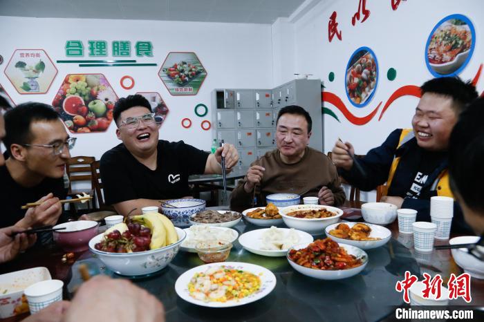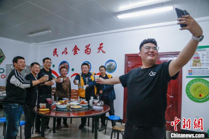 中國北方小年,青藏集團公司德令哈工務段關角隧道工區“00后”職工郝斌(左二)、趙鵬舉(右一)和工友們開心度過小年夜。中新社記者 馬銘言 攝