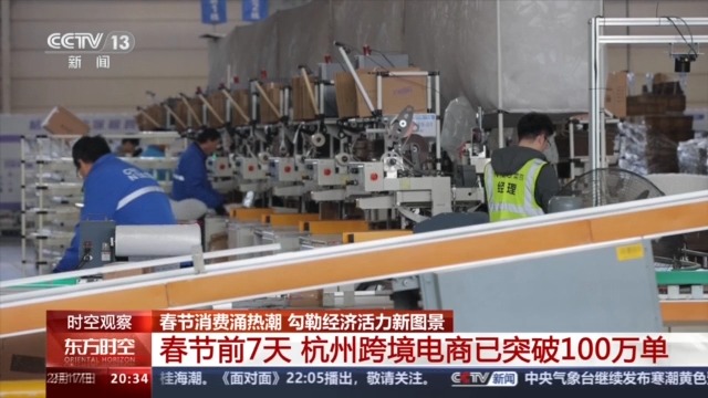 春節(jié)期間,在杭州跨境電商綜試區(qū),一排排貨架上整齊碼放著來自世界各地的“特產”,工作人員正在分揀、打包,一派繁忙景象。