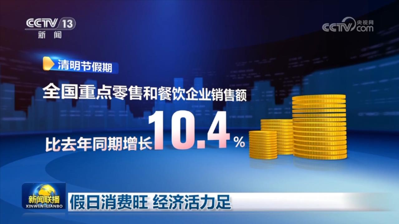 商務部商務大數據監測顯示,清明節假期,全國重點零售和餐飲企業銷售額比去年同期增長10.4%。商品消費方面,綠色有機食品、服裝、家電、通訊器材等銷售額同比增長都超過10%,全國示范步行街客流量和銷售額同比增長也都超過五成。