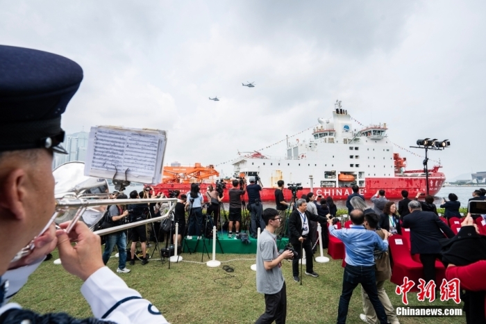 這次,香港更是以“海陸空”上陣歡迎“雪龍2”號(hào)到訪香港。在“雪龍2”號(hào)不遠(yuǎn)處,兩艘拖船和一艘消防船在碼頭附近對(duì)射水柱,形成水拱門。香港飛行服務(wù)隊(duì)的直升機(jī)飛過維多利亞港上空示意致敬,香港警察銀樂隊(duì)在現(xiàn)場(chǎng)奏樂,九龍巴士車隊(duì)貼上歡迎“雪龍2”號(hào)標(biāo)志,還有舞獅隊(duì)歡迎“雪龍2”號(hào)來(lái)到香港。