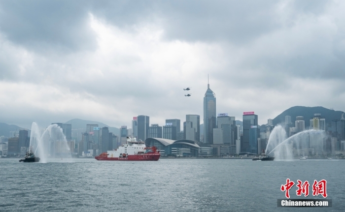 4月8日上午,中國(guó)首艘自主建造的極地科學(xué)考察破冰船“雪龍2”號(hào)抵達(dá)香港。圖為“雪龍2”號(hào)通過維多利亞港時(shí)收到海事傳統(tǒng)噴水歡迎。中新社記者 侯宇 攝