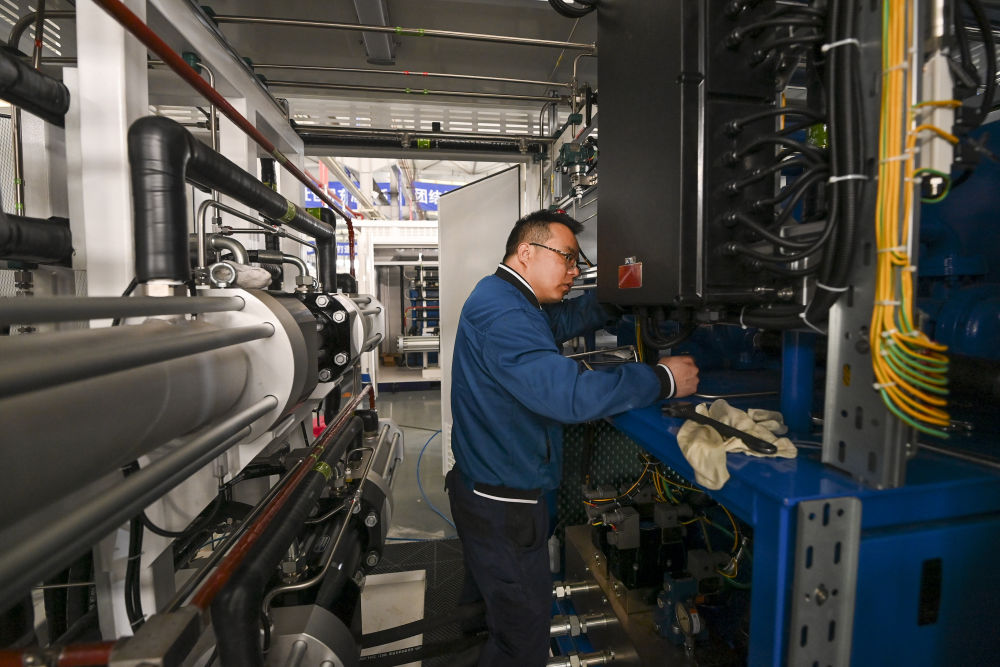 在位于山西省長(zhǎng)治市高新技術(shù)產(chǎn)業(yè)開(kāi)發(fā)區(qū)科技工業(yè)園的一家公司內(nèi),工作人員在調(diào)試氫能設(shè)備(4月2日攝)。新華社記者 楊晨光 攝
