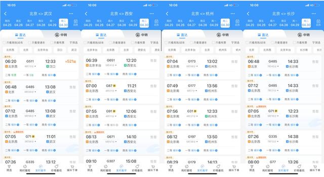 從節前預訂情況看,4月30日北京出發,前往武漢、西安、杭州、長沙等方向車票極為緊俏。截至16日16時,上述方向車票大面積售罄,僅清晨6時許出發車次尚存余票。