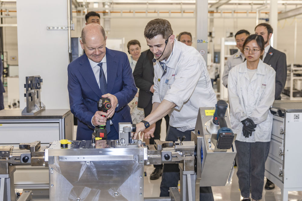 4月14日,德國總理朔爾茨在位于重慶市九龍坡區的博世氫動力系統(重慶)有限公司參訪。