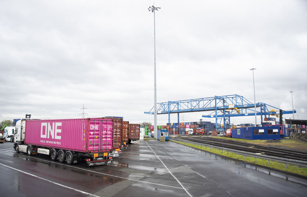 貨輪排隊停靠,火車鳴笛駛入貨運場站,卡車搭載著印有“渝新歐”“義新歐”“西安港”等字樣的集裝箱往來奔馳……這座萊茵河畔的港口,一派繁忙景象。