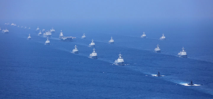 2018年4月12日,中央軍委在南海海域隆重舉行海上閱兵。這是航母打擊作戰群等接受檢閱。新華社發(莫小亮 攝)