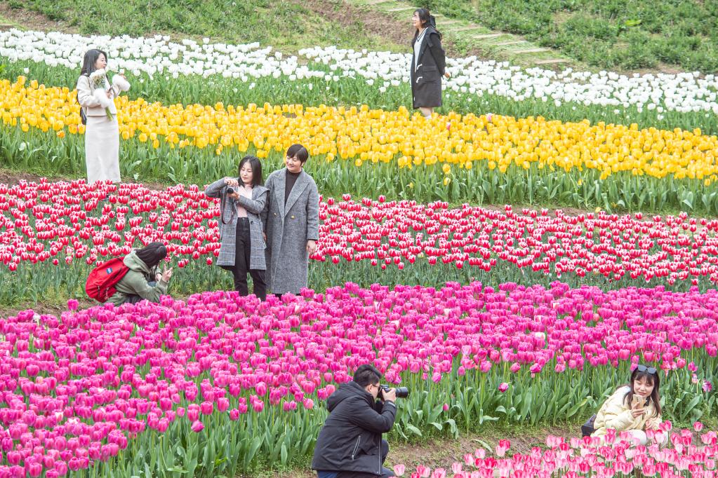 3月9日,在位于重慶市長壽區的長壽湖景區,游客在郁金香花海中賞花拍照。景區今年一共從荷蘭進口郁金香種球近60萬粒,分三大系列27個品種,種植面積約12000平米。新華社記者唐奕攝