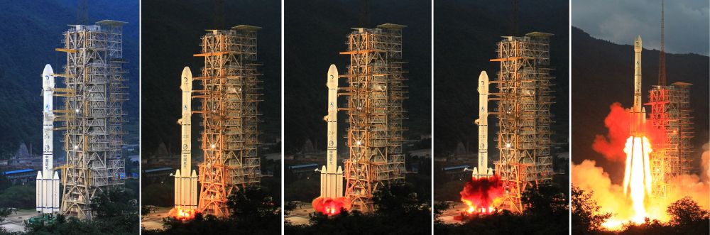2010年10月1日18時59分57秒,搭載著嫦娥二號衛星的長征三號丙運載火箭在西昌衛星發射中心點火發射。這是嫦娥二號發射瞬間的情景(拼版照片)。新華社記者 李剛 攝