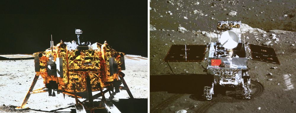 2019年1月11日下午,嫦娥四號著陸器與玉兔二號巡視器工作正常,在“鵲橋”中繼星支持下順利完成互拍(拼版照片)。新華社發(國家航天局供圖)