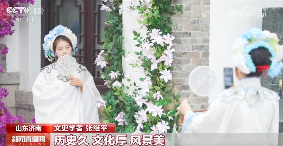 文史學(xué)者張繼平介紹:“唐宋八大家之一曾鞏先生把大明湖,現(xiàn)在叫大明湖,過去叫西湖,他把西湖的淤泥疏浚,疏浚之后就修了一道堤壩,叫百花堤,然后有百花臺(tái)。說起百花洲,有18個(gè)字可以概括它的特點(diǎn),歷史久、文化厚、風(fēng)景美、特色濃、故事多、煙火旺。歷代的文人墨客來到了百花洲附近,留下了大量贊美百花洲的詩篇。”