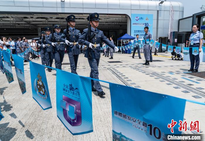 4月13日,香港特區政府保安局下轄的各紀律部隊舉行“全民國家安全教育日”開放日活動。圖為香港航空青年團成員在政府飛行服務隊開放日活動上展示中式步操。(資料圖片) 中新社記者 侯宇 攝