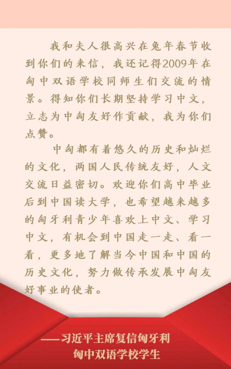 2023年春節前夕,匈中雙語學校學生胡靈月、宋智孝代表全校學生致信習近平主席和夫人彭麗媛教授,按照中國風俗拜年,講述在校學習中文12年的感受,表達將來到中國上大學、為匈中友好作貢獻的愿望。