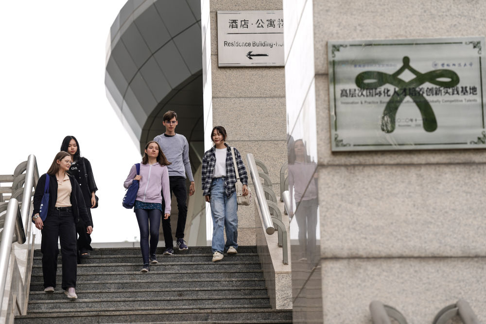 宋智孝(左二)在北京首都師范大學校園內與同學交流(2024年4月28日攝)。