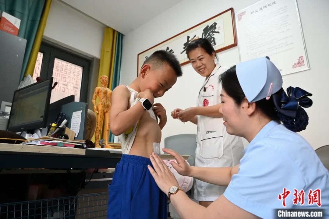 2023年7月11日,入伏首日,在內(nèi)蒙古呼和浩特市一醫(yī)院內(nèi),醫(yī)護人員為小朋友貼“三伏貼”。“三伏貼”是一種傳統(tǒng)的冬病夏治療法。劉文華 攝