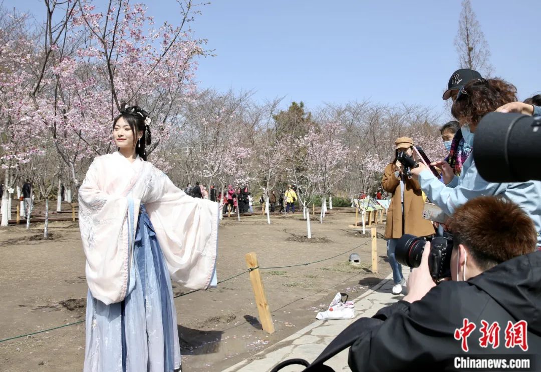 2021年北京玉淵潭公園春季賞花文化活動在春分節(jié)氣開幕,一名穿漢服的游客在櫻花樹前拍照。易海菲 攝