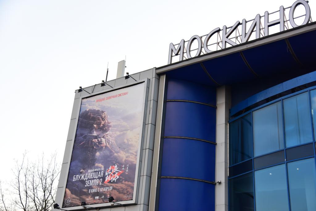 這是在俄羅斯首都莫斯科“莫斯科電影”旗下的宇宙電影院外拍攝的《流浪地球2》電影宣傳海報。新華社記者 華迪 攝