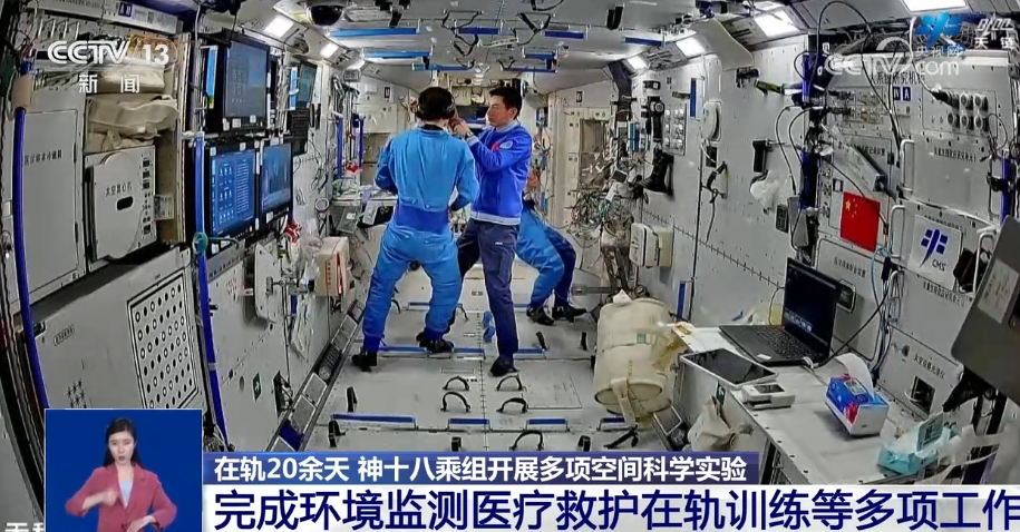 在按計劃開展科學實(試)驗及實驗裝置維護的同時,三名航天員還完成了空間站內環境監測、醫療救護在軌訓練等多項工作。