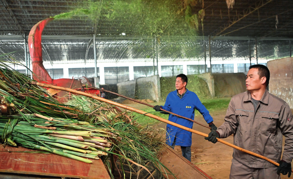 工作人員在廣西來賓市興賓區大灣鎮雙誠牧業有限公司粉碎甘蔗尾葉,準備制作牛飼料(2023年12月13日攝)周華攝
