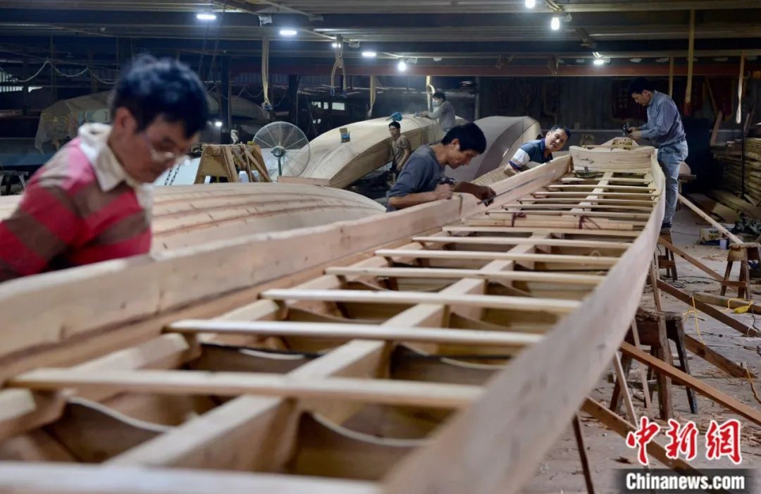 龍舟廠內,造船師傅們各顯神功,刀起錘落,在木花四濺中,傳承著龍舟傳統手工制作技藝。中新社記者 張斌 攝