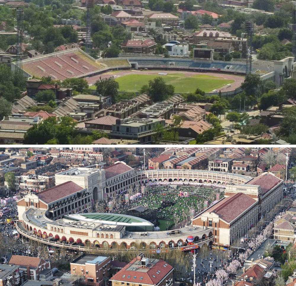 拼版照片:上圖是位于天津五大道的民園體育場(資料照片);下圖是2024年4月6日拍攝的民園廣場(新華社記者趙子碩攝)。民園廣場的前身是始建于1920年的民園體育場,曾是中國的第一個燈光足球場。經過提升改造,現在的民園廣場已經成為中西合璧的“城市會客廳”。新華社發