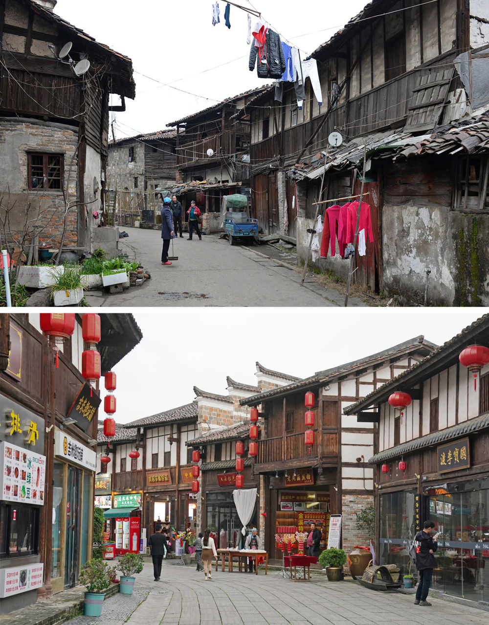 拼版照片:上圖為撫州文昌里歷史文化街區三角巷修繕前的樣貌(資料照片);下圖為同一地點修繕后的街景(2024年4月9日新華社記者萬象攝)。新華社發