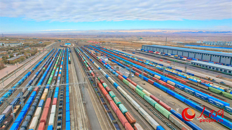 阿拉山口站編組場內(nèi)??恐l(fā)的中歐班列及其他出入境貨物列車。人民網(wǎng) 李欣洋攝