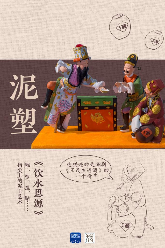 眼前這件泥塑作品,人物神形兼備。以戲劇故事人物組合為主,“塑”說著戲臺史書上的悲歡離合。潮州泥塑最大特點是貼塑,匠人先制作好泥人,然后再給它做衣服,壓泥成片、褶片成衣,將衣服一層層給泥人“穿”到身上,使人物立體而有質感,最終達到“活起來”的效果。