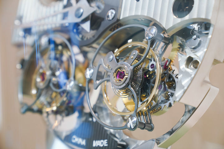 在位于遼寧丹東的孔雀表業(集團)有限公司展示中心拍攝的雙陀飛輪機芯模型(6月18日攝)。新華社記者 樊雨晴 攝