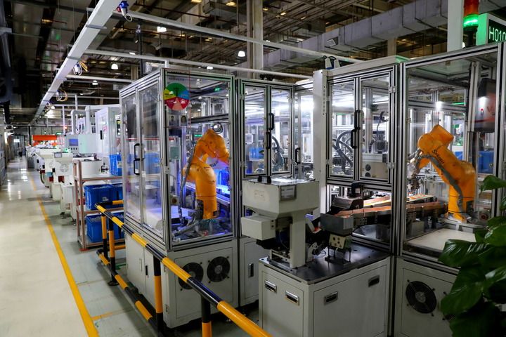 江蘇常州理想汽車智能制造基地焊裝車間的機械臂正在作業(5月31日攝)。新華社記者 柳文惠 攝