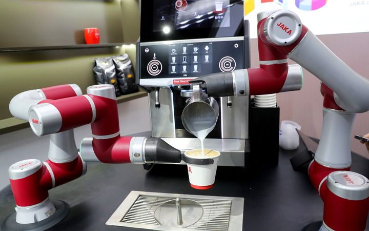 節卡機器人股份有限公司上海展廳內,機器人在表演調制咖啡(5月24日攝)。新華社記者 龔兵 攝