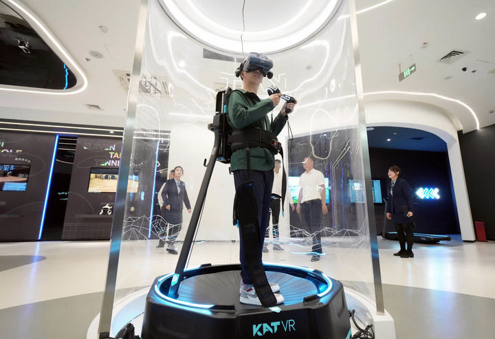 在位于江蘇蘇州昆山市的昆山元宇宙產業園元宇宙展示廳里,參觀者體驗VR游戲(6月1日攝)。新華社記者 李尕 攝