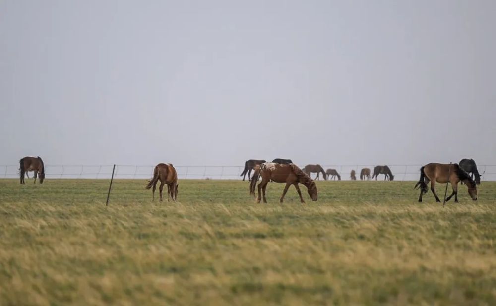 馬群在四子王旗阿木古郎草原上覓食。新華社記者 連振 攝
