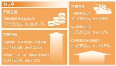 我國外貿前5月成績單近日出爐,貨物貿易進出口總值同比增長6.3%。其中,出口增長6.1%,進口增長6.4%。5月當月,進出口同比增長8.6%,出口增長11.2%,進口增長5.2%。
