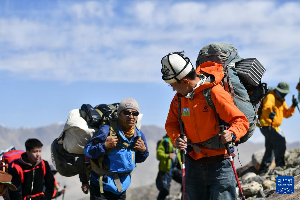 7月4日,塔西巴伊(左二)背著約25公斤的物品和同伴一起行進在慕士塔格峰的山坡上。新華社記者 胡虎虎 攝