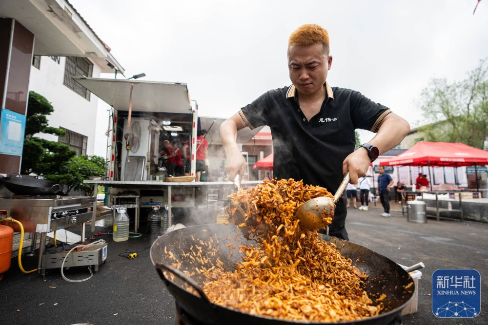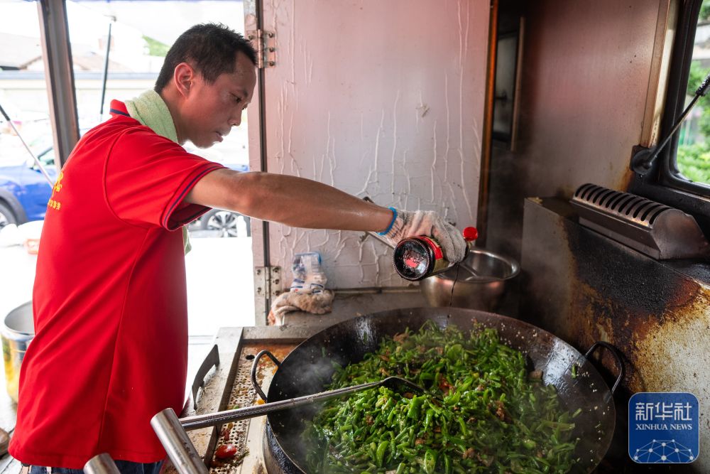 7月10日,在岳陽市良心堡鎮望君洲村,志愿者在炒制菜肴。新華社記者 陳思汗 攝