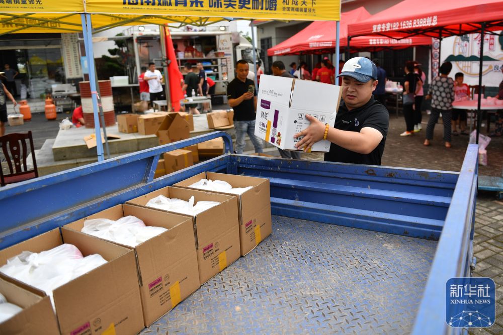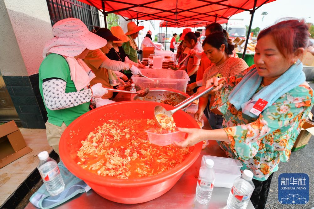 7月10日,在良心堡鎮望君洲村,志愿者在打包盒飯。 新華社記者 陳振海 攝