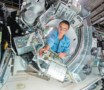 北京經(jīng)濟(jì)技術(shù)開發(fā)區(qū)永昌北路1號(hào),通用電氣醫(yī)療北京影像設(shè)備制造基地(以下簡稱“北京生產(chǎn)基地”),生產(chǎn)線上機(jī)器轟鳴,一臺(tái)臺(tái)醫(yī)療器械陸續(xù)完成裝配。通用電氣醫(yī)療在全球銷售的每三臺(tái)CT機(jī)中就有2臺(tái)產(chǎn)自這里,產(chǎn)品銷往全球100多個(gè)國家和地區(qū)。