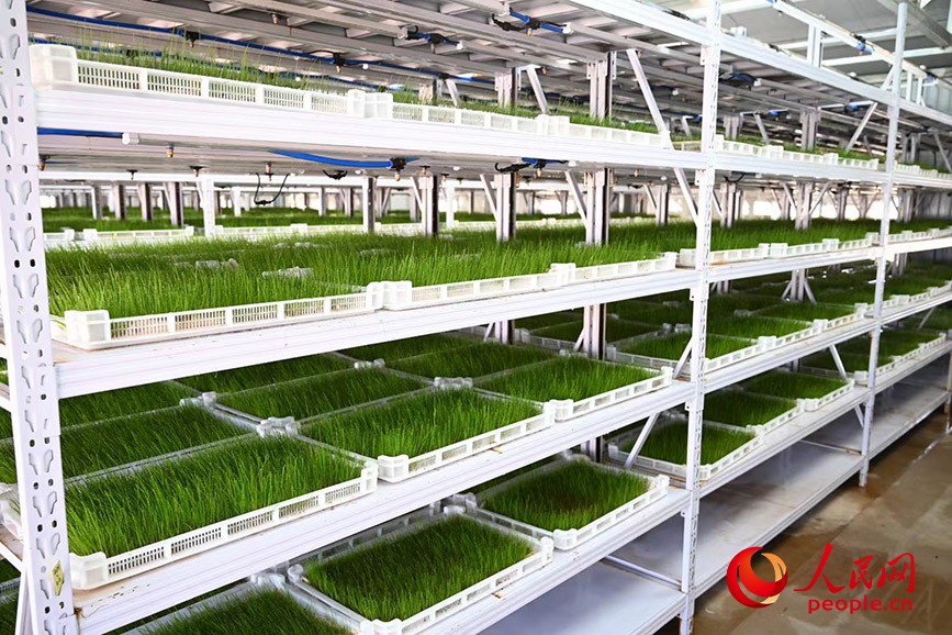 除了飼養(yǎng)蘇尼特羊的棚圈之外,牧場(chǎng)中還設(shè)計(jì)了一座溫室房,里面整齊排列的架子上,種植著郁郁蔥蔥的燕麥草,這里被牧民親切地稱為“空中牧場(chǎng)”。