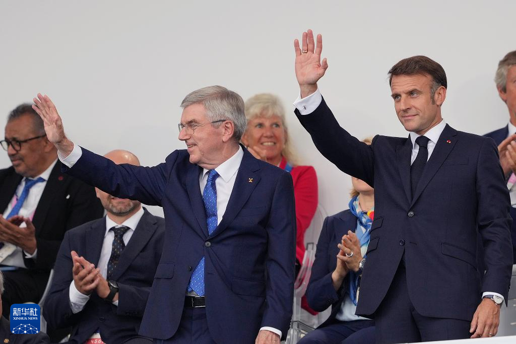 7月26日,國際奧委會主席巴赫(上左)和法國總統(tǒng)馬克龍出席開幕式。新華社記者 高靜 攝
