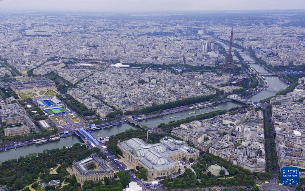 這是開幕式上拍攝的埃菲爾鐵塔(右上)、巴黎大皇宮(下)(7月26日攝)。新華社發(fā)(POOL照片)