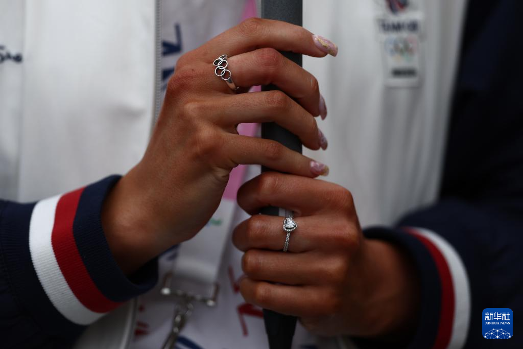 這是7月26日拍攝的一名英國體育代表團成員佩戴的有奧運五環(huán)元素的戒指。新華社發(fā)(POOL照片/娜奧米·貝克)